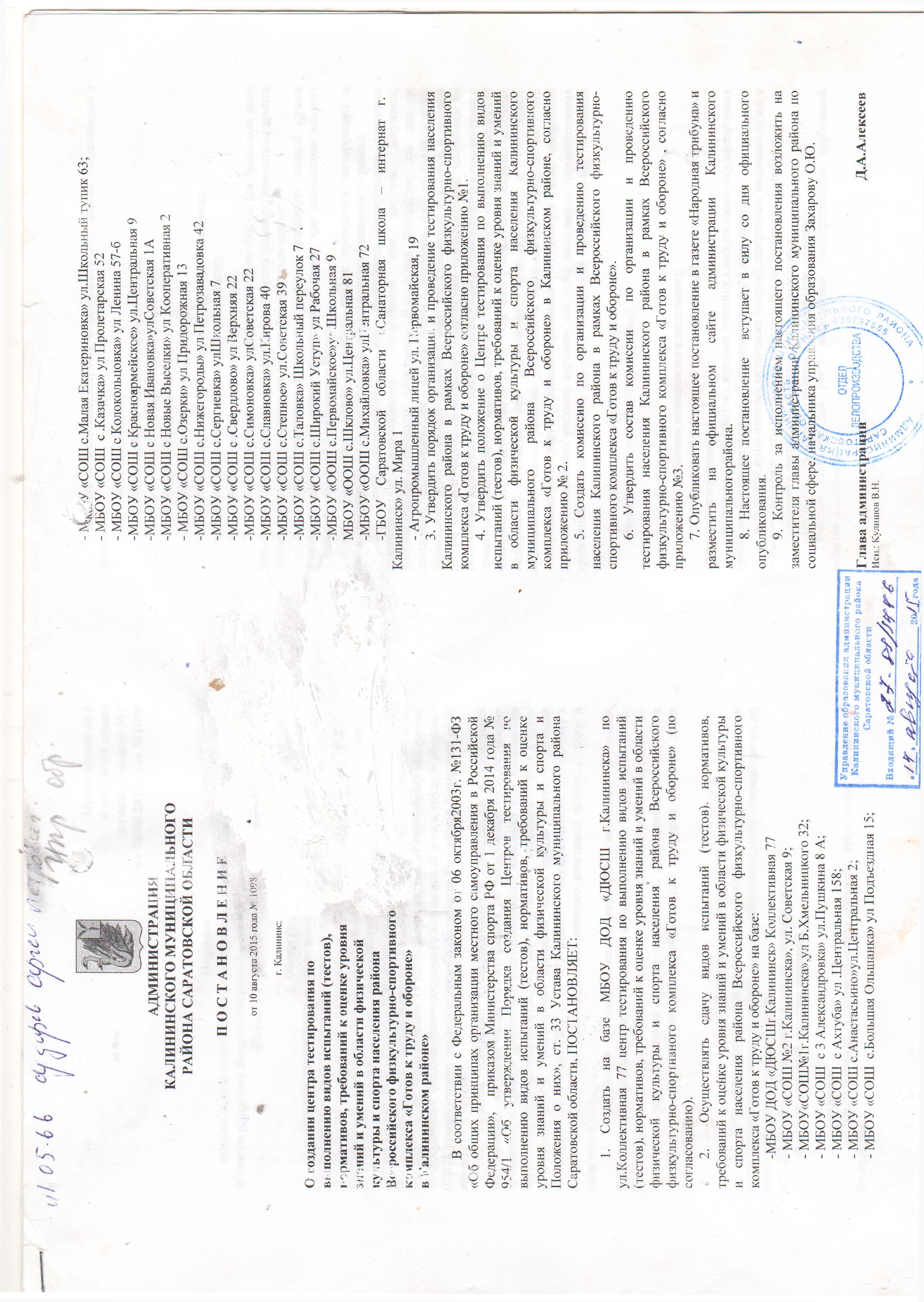 Всероссийский физкультурно-спортивный комплекс «Готов к труду и обороне»возродился в нашей стране в 2015 году. В Калининском районе центр тестирования комплекса ГТО был открыт 10 августа 2015 года. Центр создан на базе МБУ ДО «СШ г. Калининска Саратовской области».
