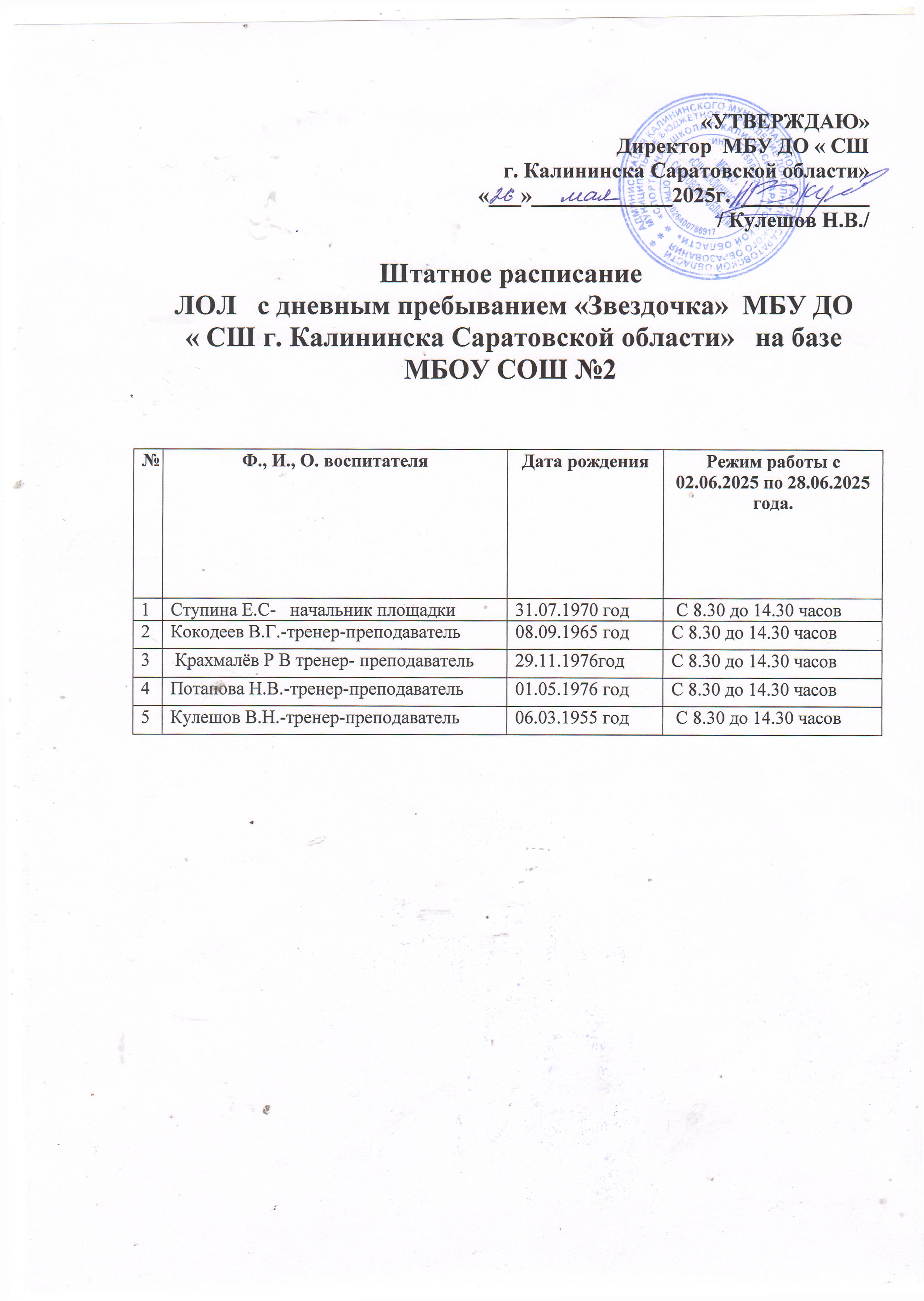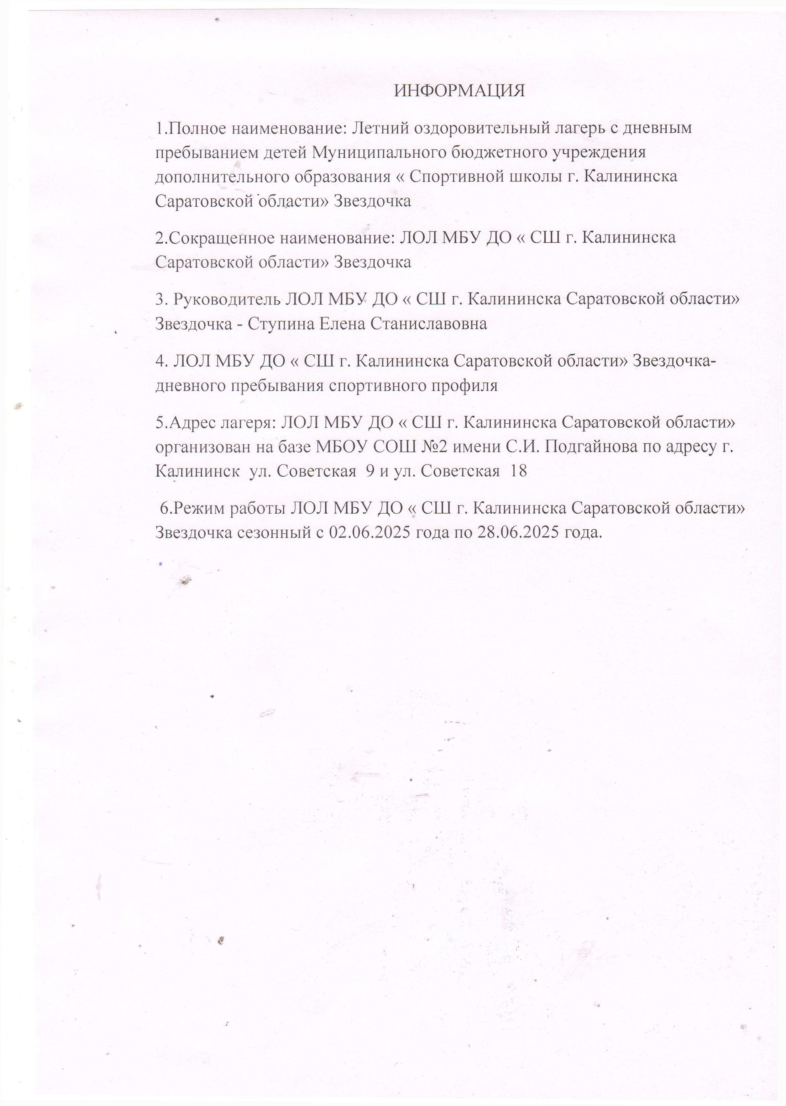- 2-го июня 2025 года открылся ЛОЛ МБУ ДО "СШ г. Калининска Саратовской области" "Звёздочка" на базе МБОУ СОШ № 2. Программа лагеря имеет физкультурно-спортивную направленность. Работают отделения: велоспорт (тренер-преподаватель Кокодеев В.Г.), лыжные гонки (тренер-преподаватель Ступина Е.С.), триатлон (тренер-преподаватель Кулешов В.Н), футбол (тренер-преподаватель Крахмалёв Р.В.), волейбол (тренер-преподаватель Потапова Н.В.). Все участники летнего лагеря совмещают интересные занятия и беседы с учебно-тренировочным процессом. Надеемся, что ребята хорошо оздоровятся в ЛОЛ "Звёздочка".